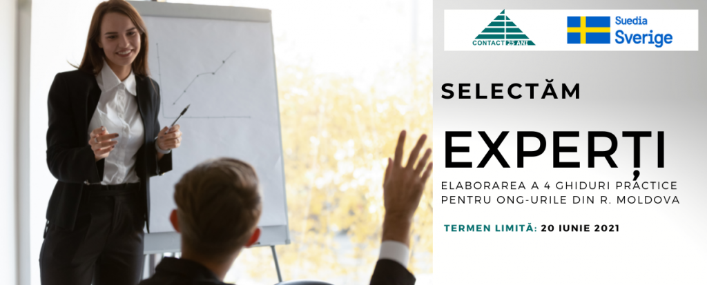 Centrul CONTACT în cadrul Programului de suport instituțional pentru dezvoltarea organizației, finanțat de Suedia, anunță concurs pentru elaborarea a 4 ghiduri practice (tutoriale) pentru ONG-urile din Republica Moldova, inclusiv UTA Găgăuzia și regiunea transnistreană.