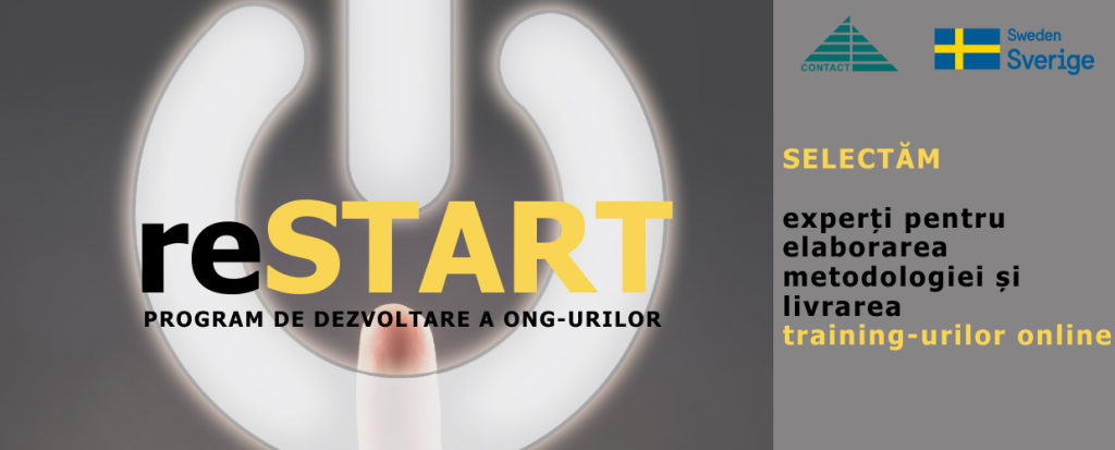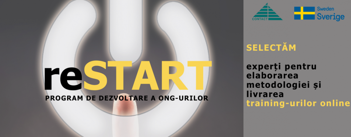 Centrul CONTACT în cadrul Programului de suport instituțional pentru dezvoltarea organizației, finanțat de Suedia, anunță concurs pentru selectarea unui expert/experte sau grup de experți în elaborarea metodologiei și livrarea training-urilor online în cadrul programului de dezvoltare a ONG-urilor: „reSTART pentru ONG-urile din Republica Moldova”.