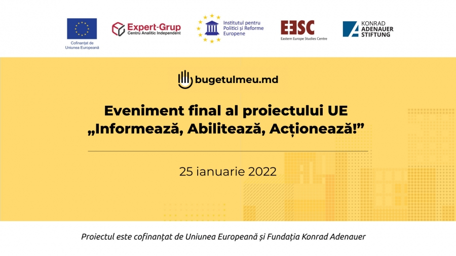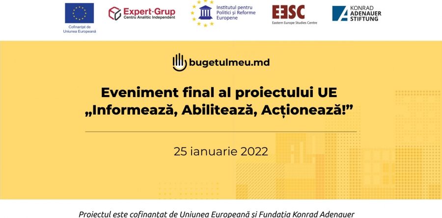 Proiectul „Informează, abilitează și acționează! Societatea civilă pentru o mai bună guvernanță bugetară în Moldova” a fost implementat în perioada februarie 2019-2022 și a fost cofinanțat de Uniunea Europeană și Fundația Konrad Adenauer. Proiectul a fost implementat de Centrul Analitic Independent „Expert-Grup”, în calitate de partener principal, în consorțiu cu Konrad Adenauer Stiftung e.V. (KAS, Germania), Centrul pentru Studii Est-Europene (CSEE, Lituania) și Institutul pentru Politici și Reforme Europene (IPRE).