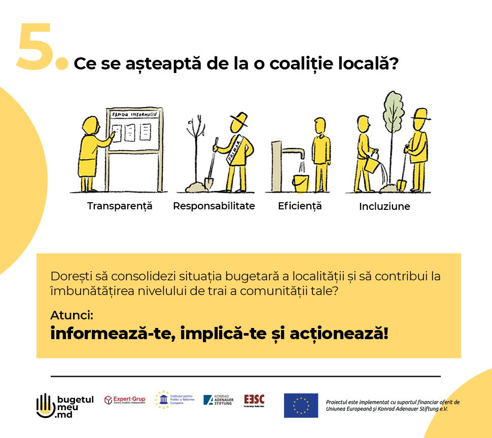 Proiectul Bugetul Meu – “Informează, abilitează și acționează! Societatea civilă pentru o mai bună guvernanță bugetară în Moldova”, este implementat de Centrul Analitic Independent ”Expert-Grup”, în calitate de partener principal, în consorțiu cu Konrad Adenauer Stiftung e.V. (KAS, Germania), Centrul pentru Studii Est-Europene (CSEE, Lituania) și Institutul pentru Politici și Reforme Europene (IPRE). Proiectul este implementat cu suportul financiar oferit de Uniunea Europeană și Konrad Adenauer Stiftung e.V.”